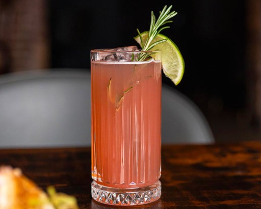 Hendricks gin, lemon juice, rosemary infused simple, rosewater liqueur